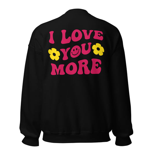 Smiley Face Black Sweatshirt, "I Love You More" on Back (Hot Pink Text, Yellow Flower)