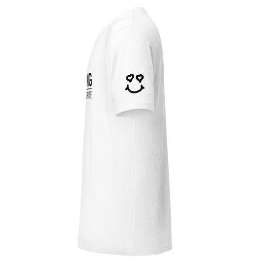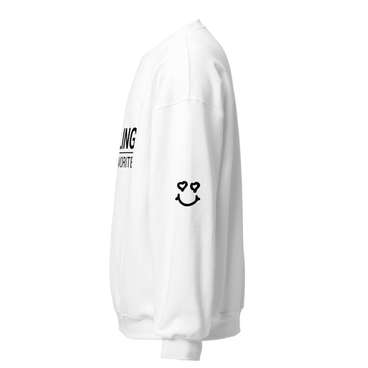 Smiling Is My Favorite - Black Text on White Sweatshirt, with Happy Face on Sleeve