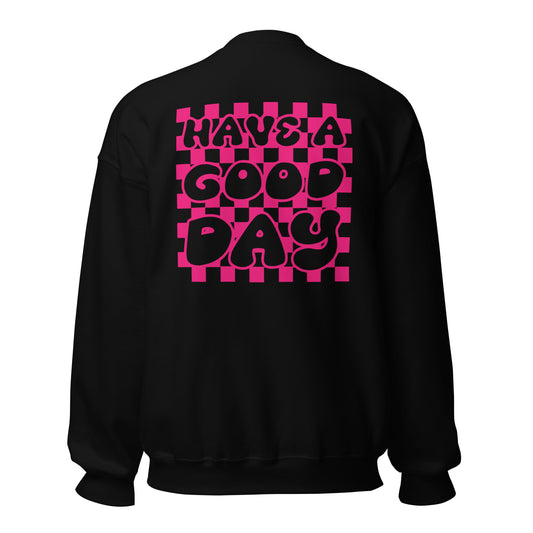 Women's Smiley Face Black Sweatshirt Hot Pink Text. "Have A Good Day" Back