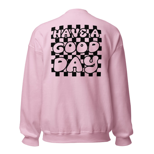 Women's Smiley Face Light Pink Sweatshirt, Have A Good Day on back in Black Text