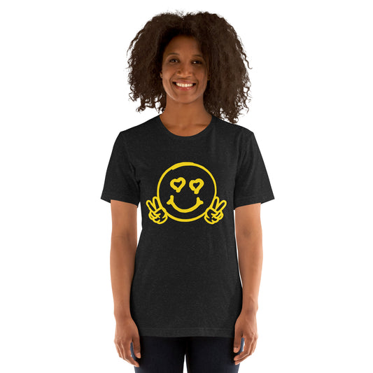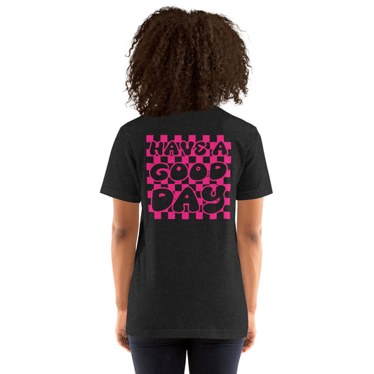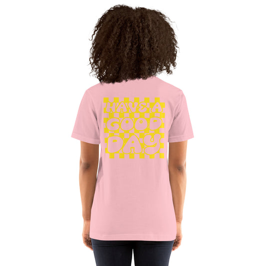 Women's Smiley Face / Happy Face Unisex T-Shirt. Yellow Text with "Have A Good Day" on Back