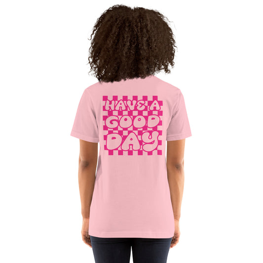 Women's Smiley Face Light Pink T-Shirt, Hot Pin Text. "Have A Good Day" on Back