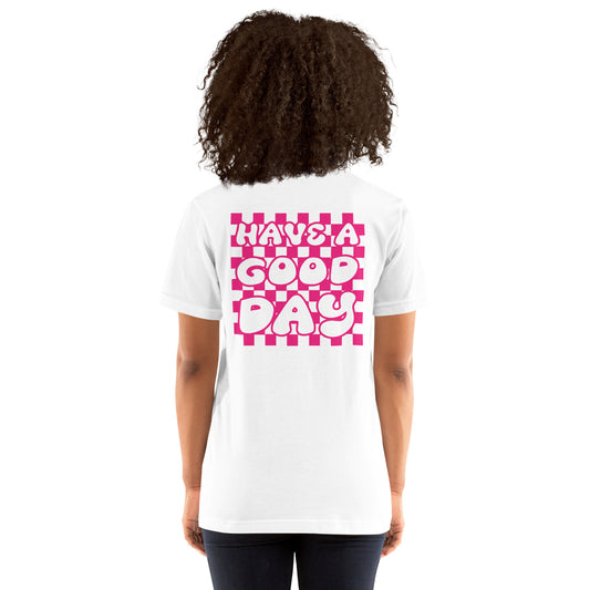 Women's Smiley Face White T-Shirt, Hot Pink Text. "Have A Good Day" on Back