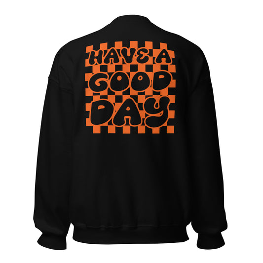 Men's Smiley Face (X) Black Sweatshirt, Orange Text. "Have A Good Day" on Back