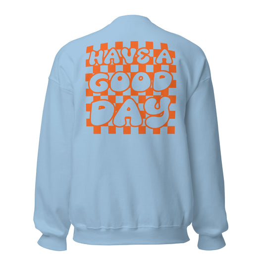 Men's Smiley Face (X) Light Blue Sweatshirt, Orange Text. "Have A Good Day" on Back