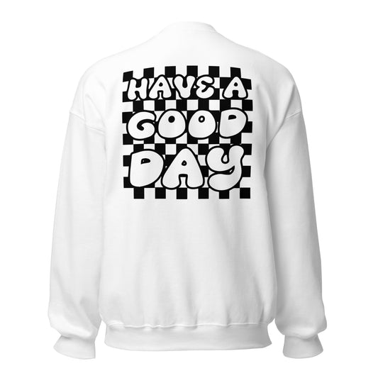 Men's Smiley Face (X) White Sweatshirt, Black Text. "Have A Good Day" on the Back