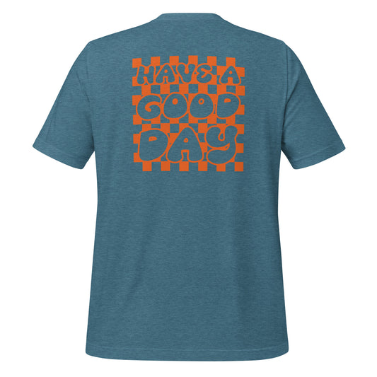 Men's Smiley Face (X) Heather Black, White Text T-shirt with "Have A Good Day" on back