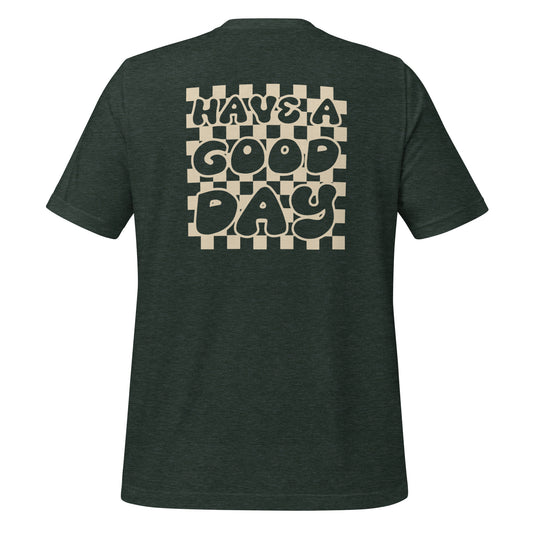 Men's Smiley Face (X) Heather Green t-shirt with Cream Text. "Have A Good Day" on Back